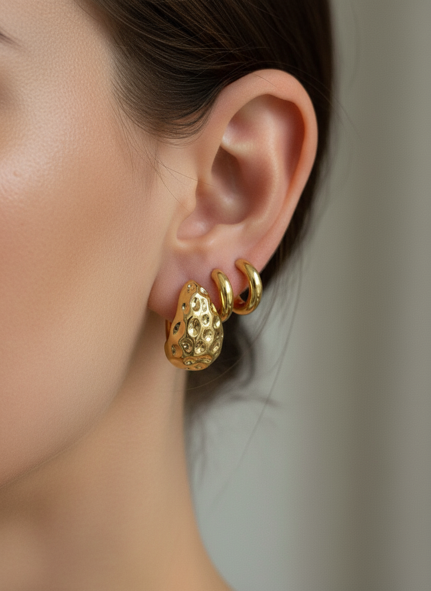 Tre personalità, un solo set. Un tris di orecchini dorati a volume pieno: