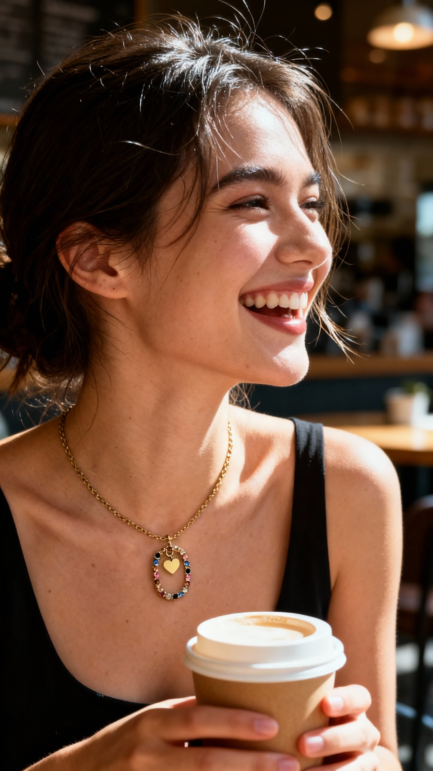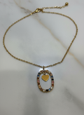 Un ciondolo ovale tempestato di strass multicolore abbraccia un piccolo cuore pendente dorato: un dettaglio romantico che illumina subito il décolleté. La catenina sottile valorizza il punto luce centrale, perfetta da sola o in layering con altre collane. Chiusura con moschettone e prolunga regolabile. Ideale per un’idea regalo dolce e quotidiana.