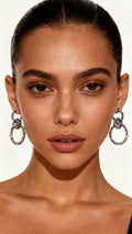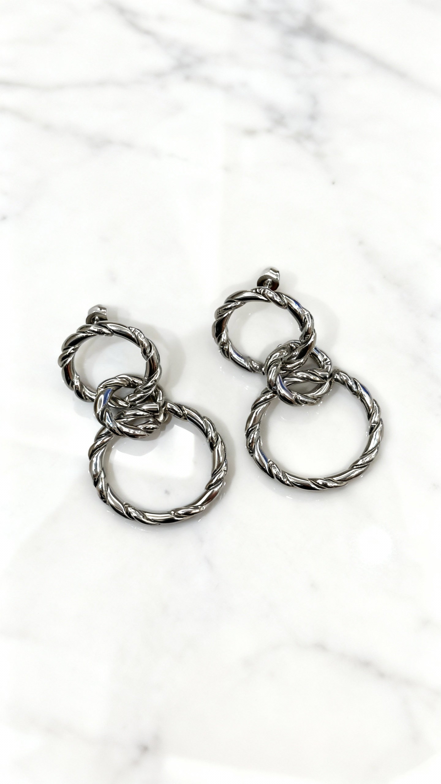 Orecchini pendenti a tre cerchi intrecciati, dal design elegante e luminoso. Raffinati e versatili, sono ideali per dare un tocco chic al tuo outfit, dal casual quotidiano alle serate più glamour.